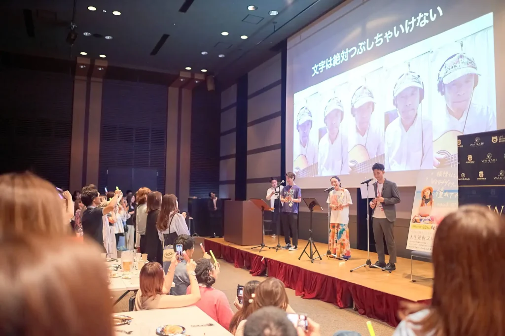 交流会終盤には校長の久保と日本デザイン社員が日本デザインスクールのオリジナルソングを披露。久保の父も奏者として映像で登場し、会場は大いに盛り上がりました。