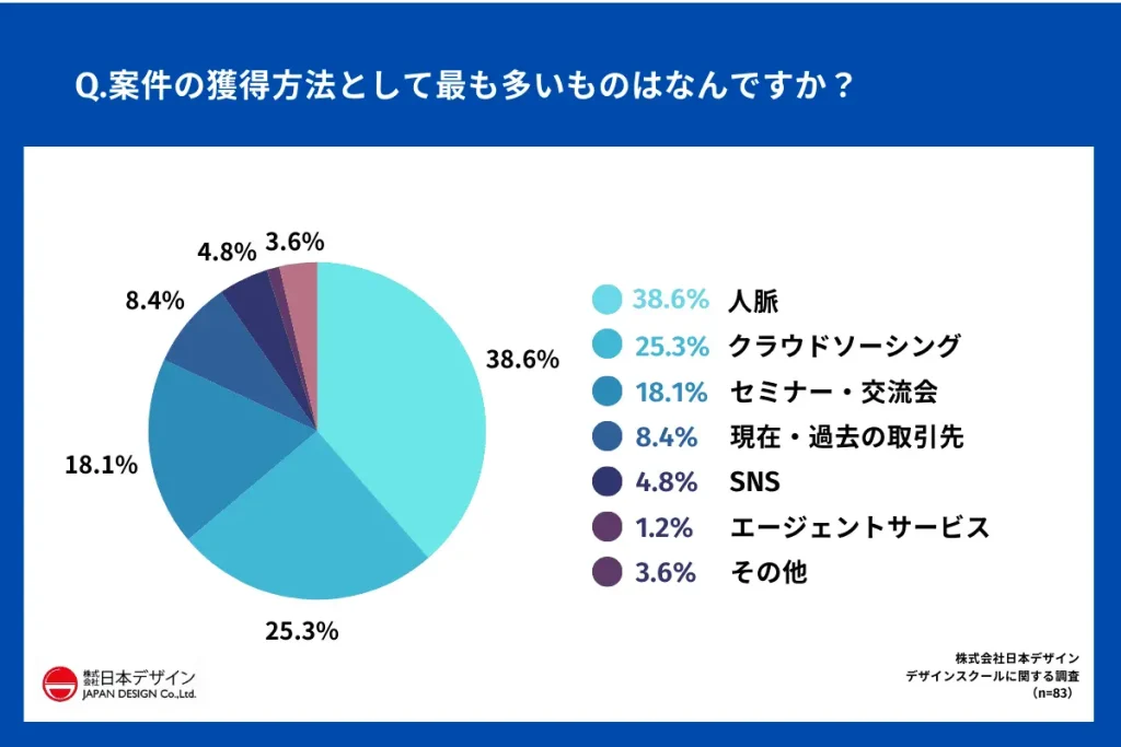 今回、株式会社日本デザインが実施した調査により、専業フリーランスWEBデザイナーの実態が明らかになりました。案件獲得の主な経路として「人脈」が最多である一方、「クラウドソーシング」や「セミナー・交流会」も活用されていることが判明しました。