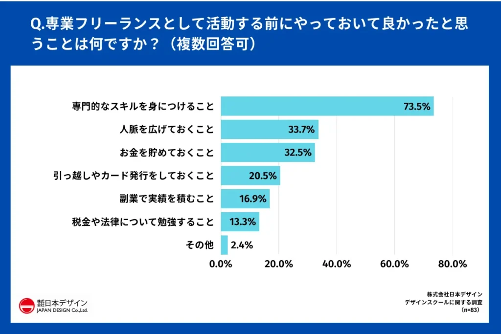 「Q.専業フリーランスとして活動する前にやっておいて良かったと思うことは何ですか?(複数回答可)」(n=83)と質問したところ、73.5%が「専門的なスキルを身につけること」と回答した。