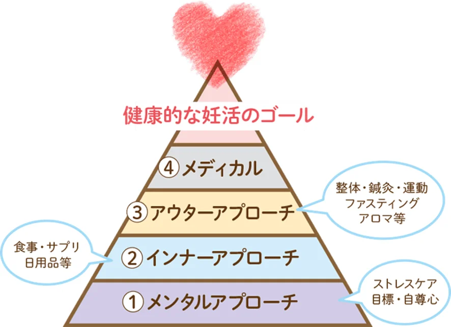 上記の妊活ピラミッドは、妊活をされている方が迷いなく妊活をするために、妊活の成功(健康に妊娠・出産し、健康な子供を産む)に必要な要素を整理したものです。妊娠だけではなく出産も、そして目の前の方が未来に授かる子供の健康も、さまざまなアプローチが必要です。特に②のインナーアプローチにおいては、以下の4つのポイントに気を付けた食生活が大事です。