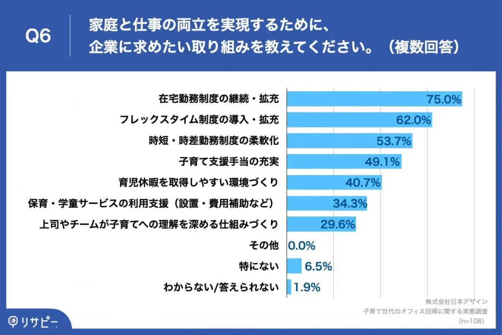 「Q6.家庭と仕事の両立を実現するために、企業に求めたい取り組みを教えてください。(複数回答)」(n=108)と質問したところ、「在宅勤務制度の継続・拡充」が75.0%、「フレックスタイム制度の導入・拡充」が62.0%、「時短・時差勤務制度の柔軟化」が53.7%という回答となりました。