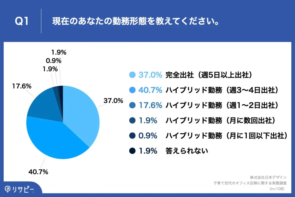 株式会社日本デザイン(本社:東京都豊島区、代表:大坪拓摩(おおつぼ・たくま))が運営するゼロイチWEBデザインスクール「デザスク」(https://japan-design.jp/design-school)は、小学生以下の子どもを持ち、過去1年以内に在宅勤務経験があり、現在は完全出社またはハイブリッド勤務をしている会社員(30〜45歳)108名を対象に、子育て世代のオフィス回帰に関する実態調査を実施しましたので、お知らせいたします。