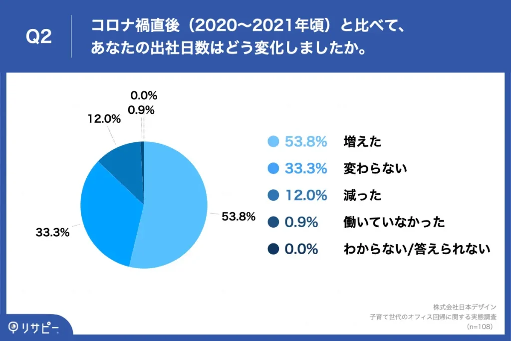 「Q2.コロナ禍直後(2020〜2021年頃)と比べて、あなたの出社日数はどう変化しましたか。」(n=108)と質問したところ、「増えた」が53.8%、「変わらない」が33.3%という回答となりました。