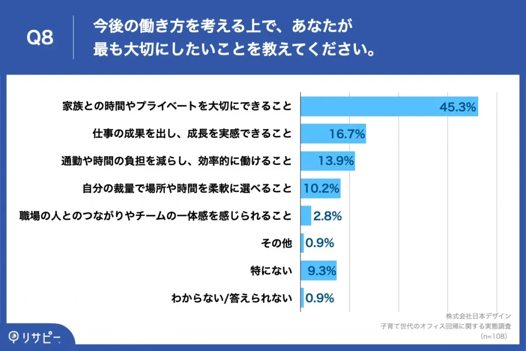 「Q8.今後の働き方を考える上で、あなたが最も大切にしたいことを教えてください。」(n=108)と質問したところ、「家族との時間やプライベートを大切にできること」が45.3%、「仕事の成果を出し、成長を実感できること」が16.7%という回答となりました。