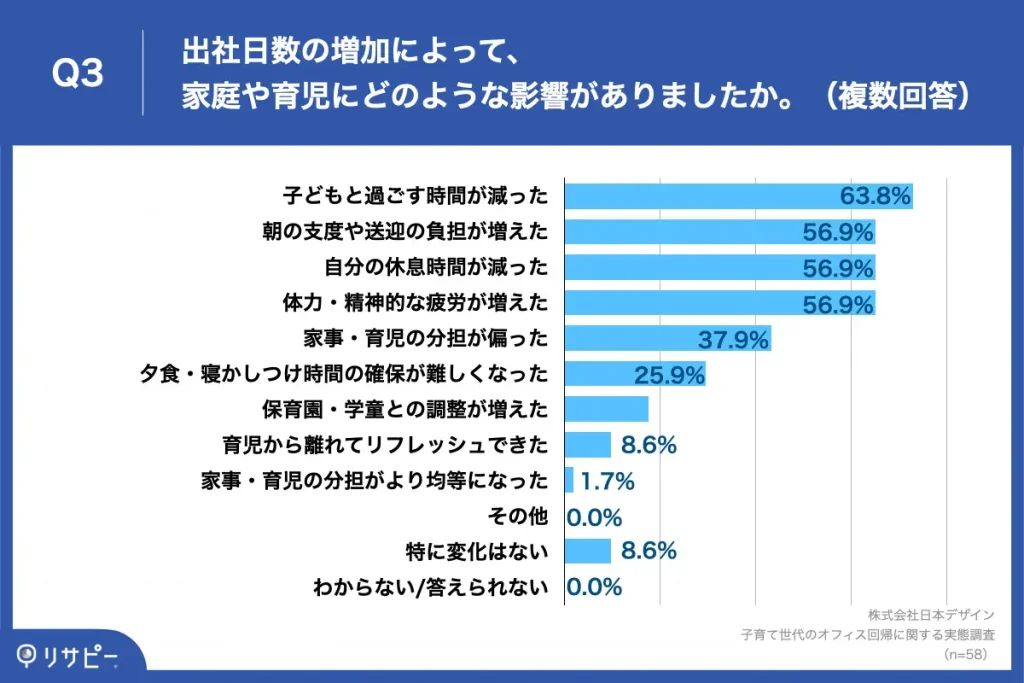 Q2で「増えた」と回答した方に、「Q3.出社日数の増加によって、家庭や育児にどのような影響がありましたか。(複数回答)」(n=58)と質問したところ、「子どもと過ごす時間が減った」が63.8%、「朝の支度や送迎の負担が増えた」が56.9%、「自分の休息時間が減った」が56.9%、「体力・精神的な疲労が増えた」が56.9%という回答となりました。