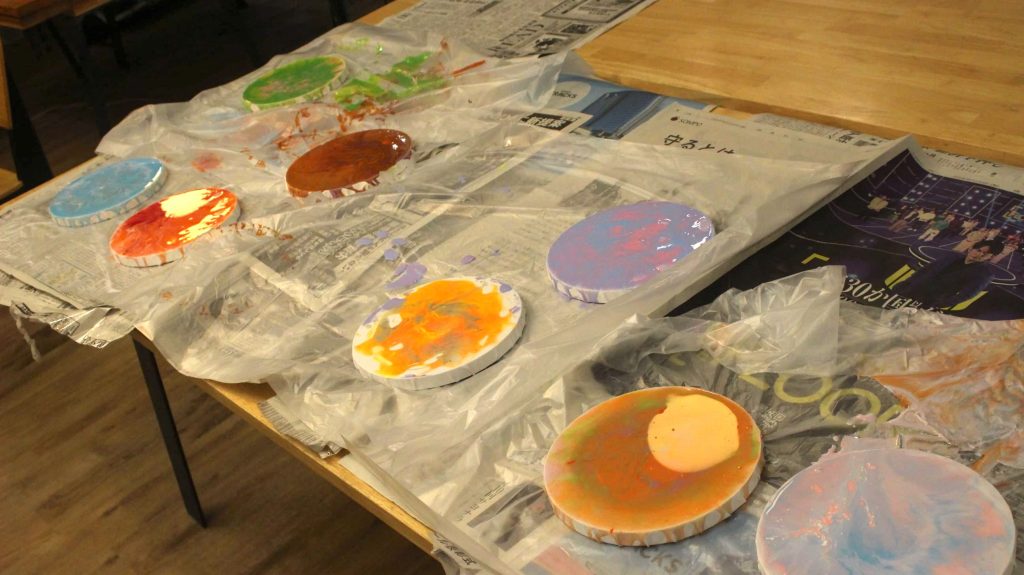複数の絵の具を混ぜ、たらしこむことで唯一の色、デザインができる、そんなアートです。