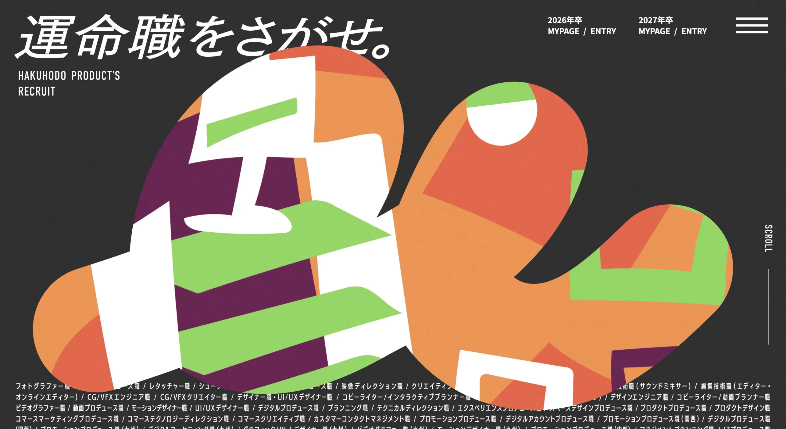 - 高彩度カラーと大きな見出しを組みあわせた採用サイトです。ホバー時の色反転や写真表現が印象的で、挑戦的な企業姿勢をストレートに表しています。