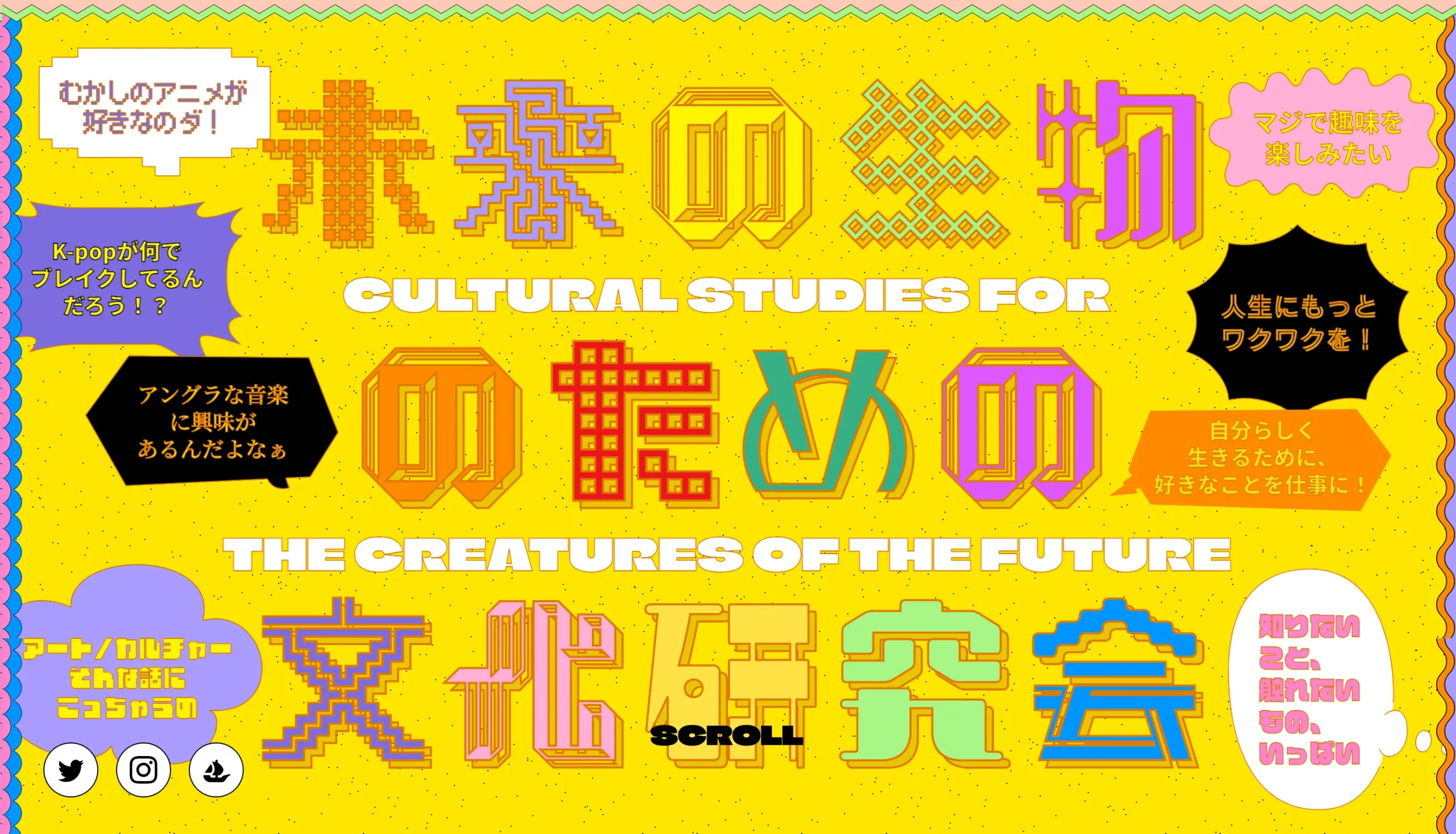 - ビビッドな配色と個性的なフォント、イラストを大胆に使用したサイトです。横スクロールの動きが加わり、研究会の世界観を遊び心たっぷりに体験できます。