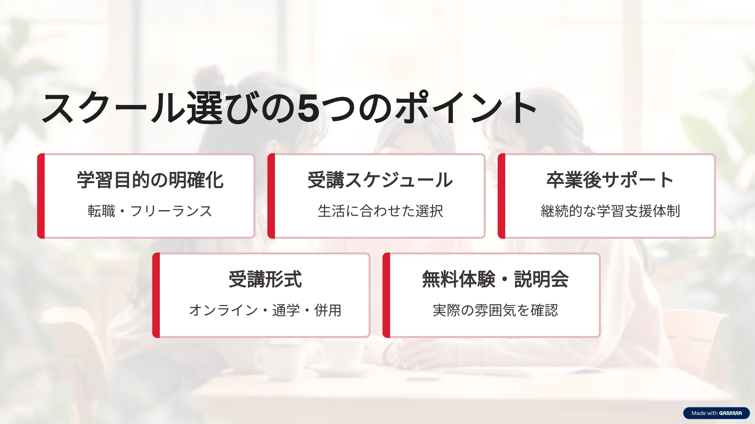 自分のライフスタイルや価値観にあわせて受講形式を選ぶことが、学習を継続しスキルをしっかり身につけるポイントになります。