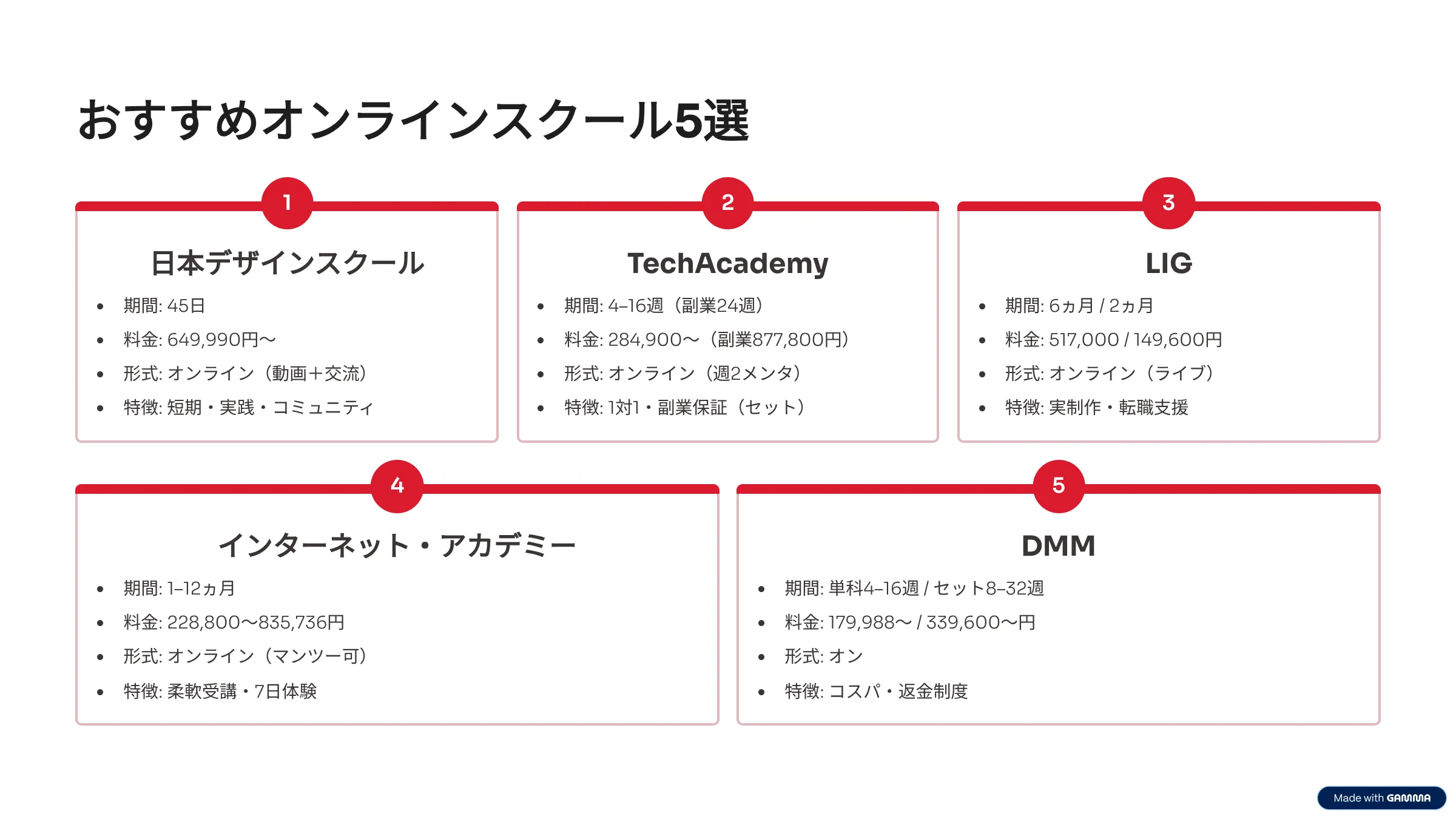 それぞれ詳しく説明します。ぜひ、自分のスクール選びの際に参考にしてください。