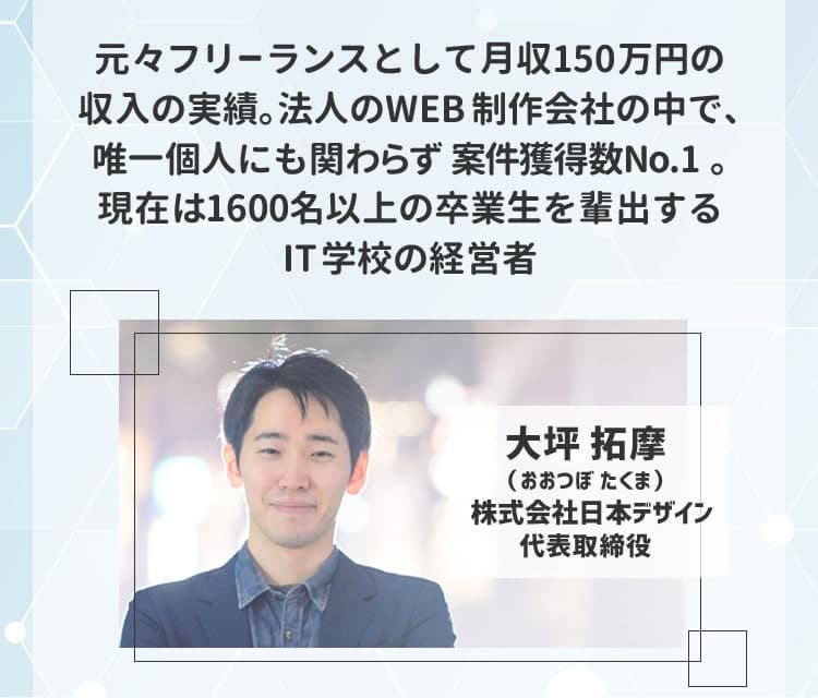 元々、個人でフリーランスのWEBデザイナーを経験し、月収150万円の収入や法人のWEB制作会社がたくさんいる中で、お仕事紹介サイトの中で、唯一個人で案件の獲得数No.1の実績だった。5年前から経営するITスクールでは、WEBデザイン、WEBライティング、 動画編集、プログラミングなど卒業時には即戦力になれるカリキュラムで、就職、転職、副業、フリーランスとして活躍しています。